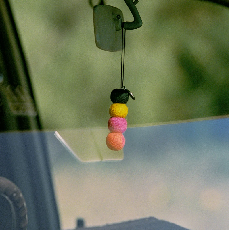 4 unscented felt balls with branded charm and elastic string for easy hanging & a 5 ml fragrance vial.